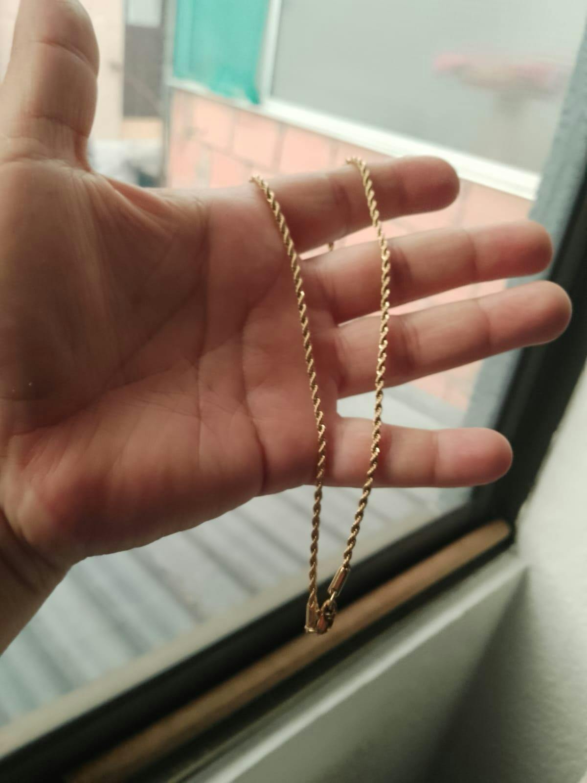 Cadena de tejido lazo en oro laminado, fina, luminosa y versátil, ideal para usar sola o acompañar con otros accesorios, sutil y elegante para todos los días.